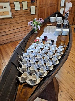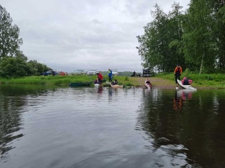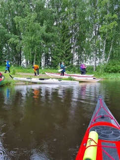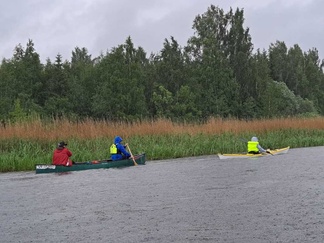 Lopuksi lähdimme kävelemään rantaan ja työntämään kanootteja vesille, taas satoi ja oli alkanut hieman tuullakin. Matti jäi vielä hyvästelemään sukulaisiaan meidän jo meloessa. Kirkkovene jäi rantaan odottamaan poiskuljetusta.