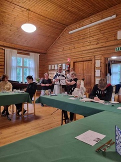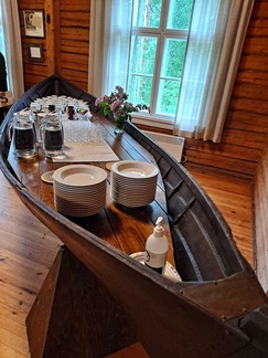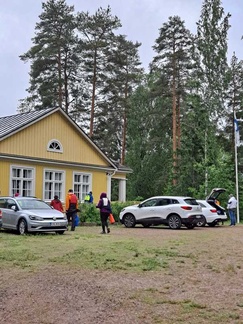 Soutelustadionin rannassa Mommilan järven eteläpäässä rantauduimme, kirkkovene ensin ja kanootit perässä. Rannasta kävelimme vajaan kilometrin Kotipirtille, hieman siistiytymistä, joillain vaatteiden vaihtoakin ja sisälle saliin.