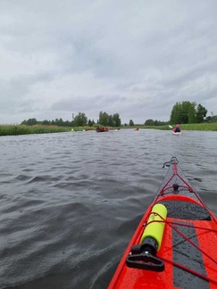 Me purimme oman kalustomme rantaan ja kamat kyytiin, työnsimme kirkkoveneen rannasta ja lähdimme melomaan perässä. Hyvin näkyi iso vene kulkevan ja kääntyilevän mutkissa, vauhtiakin se sai aikaan, odottelivat meitä välillä.