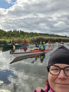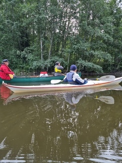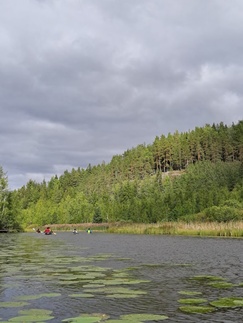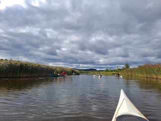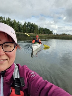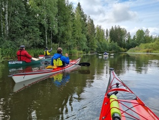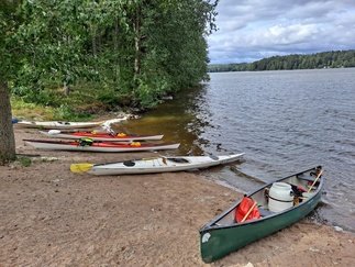 Hiljaista oli niin maalla kuin vesilläkin, järvikin oli tyyni, kun läksimme melomaan. Matkassa oli tällä kertaa yksi avokaksikko ja 4 yksikkökajakkia, joita meloimme 6 henkilön voimin.