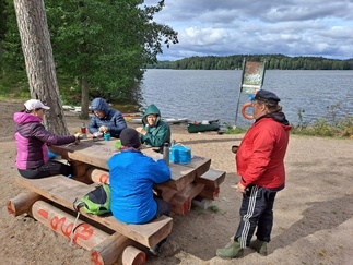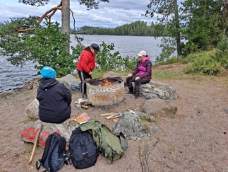 Kesijärven uimarannalla rantautuminen ja evhäät esiin, uimareita ei näkynyt, perheporukka oli sytyttelemässä tulia, joten toimme vain omat puut lisäksi nuotioon. Makkarat paistuivat ja maistuivatkin, melkein koko kesän jatkuneen m. palovaroitusajan jälkeen.