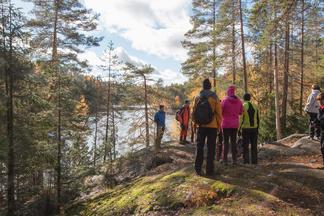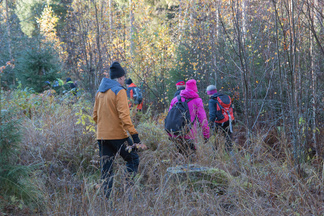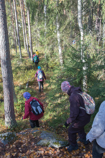 Kävelimme Aarinnansuon kautta ulkoilureittiä Iso-Karhulammelle nuotiotauolle, matkalla tieten pysähdeltiin ja kerrattiin maastoja ja historiaa.