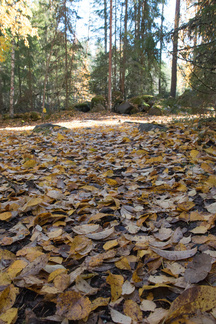 Hetken huokaisun jälkeen jatkoimme patikointia kalliopolkua seuraten kohti Iso-Kypärä lampea. Laskeuduimme Piilolammentieltä Iso-Kypärän rantaan luonnonsuojelualueen ja kunnanrajaa myötäilevää vanhaa polkua pitkin. Piilon tieltä puuliiterin kohdalta rantaan laskeutuva varsinainen polku-ura kulkee niin jyrkässä ja kivikkoisessa rinteessä, etten tohtinut viedä joukkoamme sen kautta.