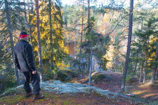 Suurempi joukko suuntasi askeleensa Piilolammen polulle Jukan vetäessä joukkoa. Piilon pohjoispäässä nousimme ensin vanhan louhoksen yläpuoliselle kalliolle. Ihailimme auringonpaisteessa kylpevää maisemaa. Nousimme myös lammen varsinaisen pohjoispään kalliolle. Nousureitiltä on poistettu siinä aikaisemmin ollut köysi, mutta tassu piti ja pääsimme ylös.