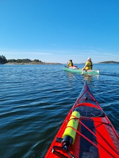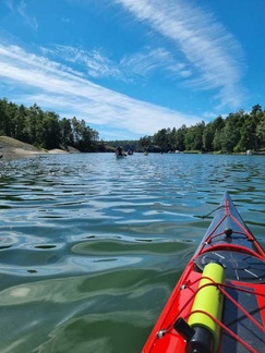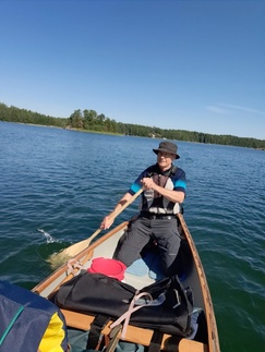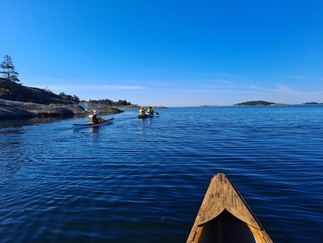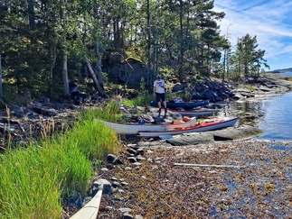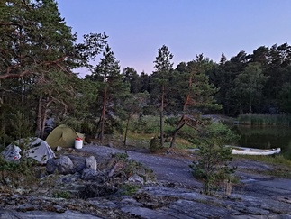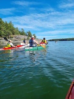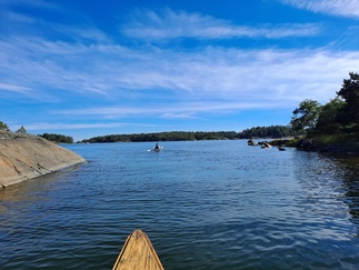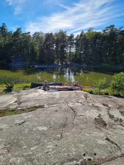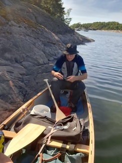 Kalusto ja tavarat kanootteihin ja vesille. Melasimme Ängholmenin pohjoispuolta ja itäpäästä suuntana etelä Kurofjärdenin ja Vindholmsfjärdenin läpi Modermagenin saarelle.