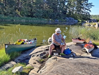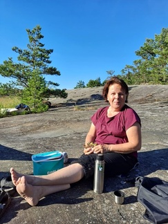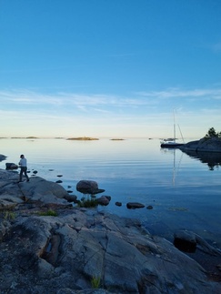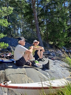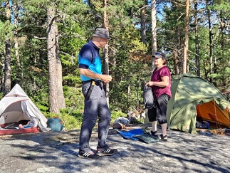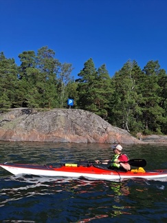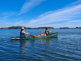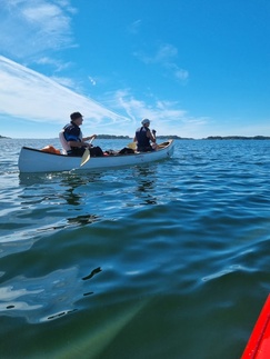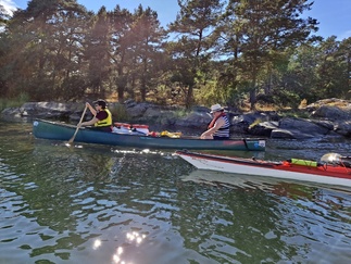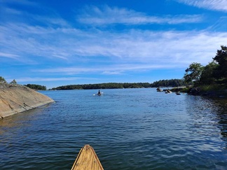 Maisemat olivat huikeita, silokallioisia saaria ja luotoja joka puolella. Kartalla ja kompassilla (pallokompassi kanootissa) suunnistaminen saarisokkelikossa tuntui välillä hankalalta, mutta kännykän karttaohjelmalla pari kertaa paikansimme itsemme.