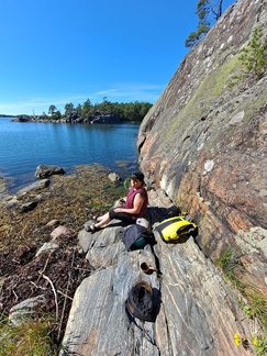 Rödjanista suuntasimme länteen kohti Bygholmenin saarta, joka kuuluu Uudenmaan virkistysalueyhdistykselle. Kiersimme saaren ja rantauduimme saunarantaan lounastamaan, sauna on itsepalveluperiaatteella toimiva, myös muut leirintä palvelut löytyvät saarelta eri paikoista. Täällä, kuten muillakin saarilla oli myös muita melojia pienissä ryhmissä sekä purje- ja moottoriveneitä, kotimaisia ja ulkomaalaisia.