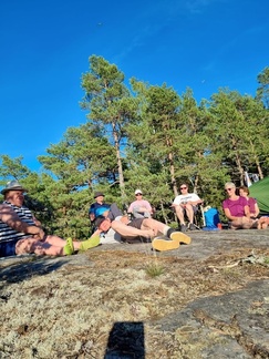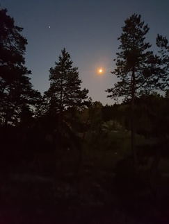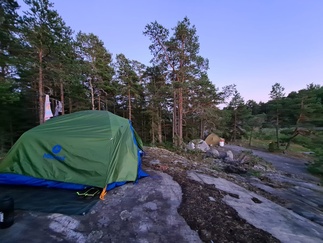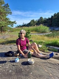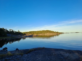 Jatkoimme matkaa länteen Fladalandetin saarelle, jossa oli vastaavat palvelut ja pinta-alaa hieman enemmän. Leiripaikkakin löytyi lahdenpohjukasta silokallion rannalta. Leiriydyimme ylemmäs kallion päälle ja aikaa viettämään. Kallio oli mukavan lämmin koko illan. Hyvin nukutti, kuutamoa oli yksi sun toinen käynyt yöllä katsomassa, jotkut olivat yöllä kuulleet ammuntaakin.