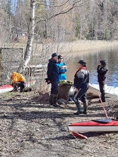 Padolla taas kantohommia, padon e-puolelta kalustoa veteen nonstoppina. Nyt lähdimme jokiosuudelle Kytäjokea myötävirtaan, vettä oli hyvin ja se virtasikin. Matkalle osui yksi kapeahko lankkusilta, jonka alta ei mahtunut. Eli kanoottti ylös ja ohi vetäen, jotkut kaksikot pääsivät ali, kun etumeloja nousi sillalle ja toiselta puolelta taas kyytiin, takameloja puolestaan teki vuorollaan saman.