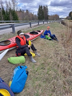 Vantaanjokeen yhdyimme sujuvasti, Kuninkaankoskea Vatvuorien välistä ja kohta olimmekin rantautumispaikassa, 3-tien sillan pielessä Veikkarissa. Kaluston kiskontaa ylös rantapenkkaa.