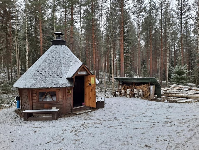 Jatkoimme kuitenkin latureittiä vielä Tapainlinnan koululle asti, ennen kuin palasimme kodalle. Tämä osoittautui tyhjäksi, eli valmiiksi ladottuja puita ei kukaan vielä ollut tuikannut tuleen. Meilläkään ei aikaa ollut jäämään tulta tuijottelemaan, joten arvoitukseksi jäi, olisiko päivän mittaan savu vielä noussut kodan piipusta. Paluumatkalla kurvasimme Suokadun parkkipaikan kautta Ahdenkallion kehätien nousuun. Kenraalikulman nurkalla palasimme jälleen tuloreitille. Nummenmäen parkissa autojen määrä oli tällä välin ainakin tuplaantunut. Alttarikiven opastaulua ihmettelimme hetken.