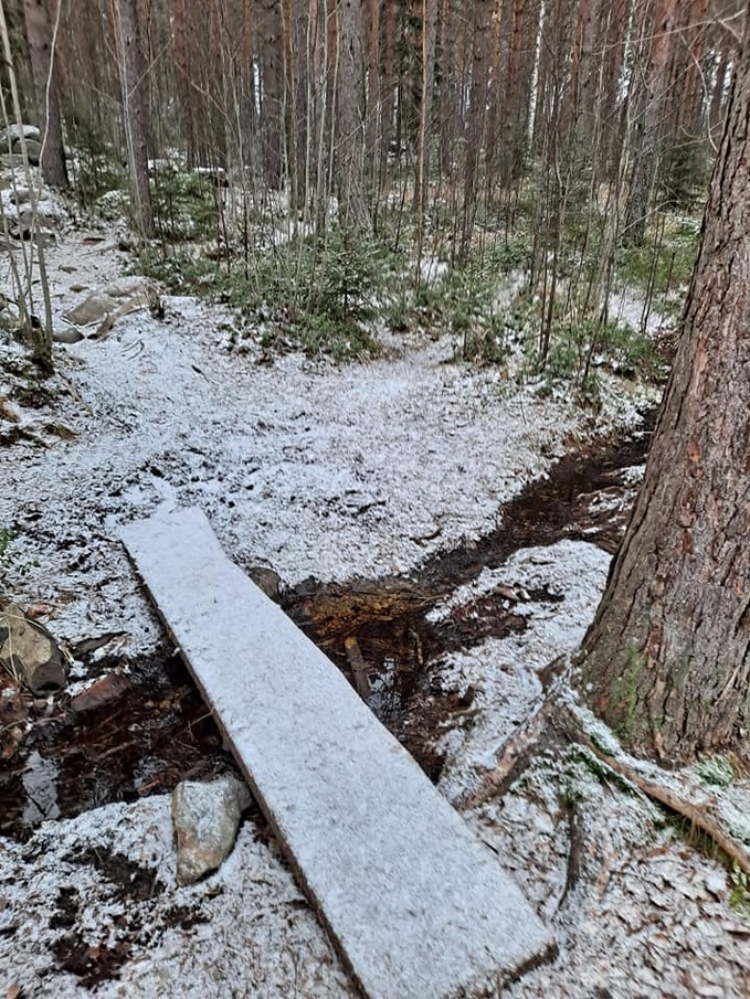 Kellon käytyä minuutin yli kymmenen lähdin johtamaan joukkoa, sillä minusta vaikutti siltä, ettei tällä kertaa matti myöhäisiä olisi odotettavissa. Nummenmäen parkissa oli puolenkymmentä autoa, mutta yhtään golfaajaa emme onnistuneet näkemään, vaikka olosuhteet vaikuttivat sopivalta myös kiekkojen heittelyyn. Tanssikallion kohdalla latureitti kohosi retkemme korkeimmalle kohdalle, joten päällä huokasimme hetken. Sen jälkeen laskeuduimme Suokadun parkista tulevalle reitille ja jatkoimme Martin kodalle, jonka ulkopuolelta löysimme taulun, maja auki. Olin yrittänyt löytää tietoa asukasyhdistyksen sivuilta, siinä kuitenkaan onnistumatta, joten ilahduimme asiasta suuresti.