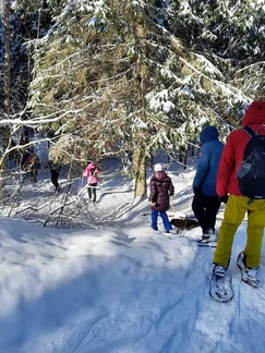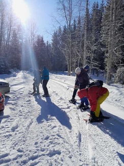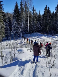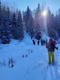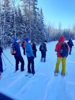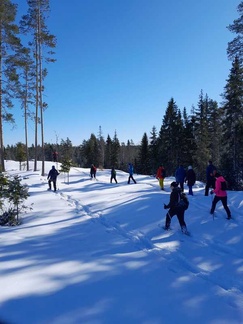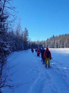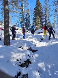 Keli suosi retkeämme, kun maassa oli noin 10cm uutta lunta, aurinko paistoi pilvettömältä taivaalta ja lämpömittari näytti muutamaa pakkasastetta. Kaikki 13 osallistujaa saivatkin täten nauttia mitä mahtavimmasta lumikenkäilykelistä noin reilun kolmen kilometrin matkalla. Tänään kyse oli laadusta, ei niinkään matkasta.