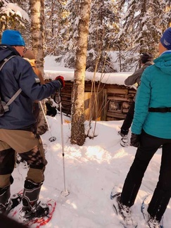 Soviteltiin kengät jalkaan, käytiin hieman perusasioita lumikenkäilyyn liittyen lävitse ja sitten matkaan. Suuntasimme Pikku Piilolammelle, josta jatkoimme edelleen niin kutsutulle Röllin tuvalle. Eipä ollut Rölli kotona, vaikka ihan tupaan sisälle kurkistimmekin.