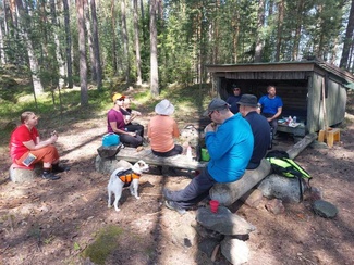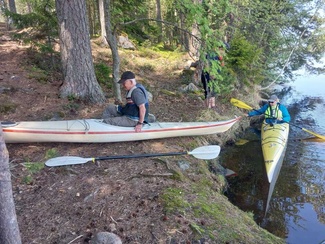 Sieltä takaisinpäin Käärmesaaret kiertäen ja saaren ”loikoilukallioita” ohimennen katsastaen kohti Selkäsaaria. Rantauduimme ja nousimme mäelle evästelytauolle, ns. ”kylmä lounas” kulohälytystilan vuoksi.