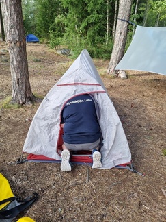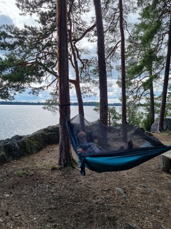 Teltat pystyyn ja pari riippumattoa roikkumaan, ruokailua ja illanviettoa. maisemat olivat hienot Vanajaveden suuntaaan koska olimme muutamia metrejä veden pinnasta.