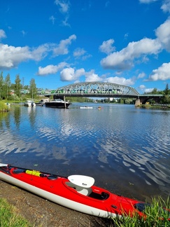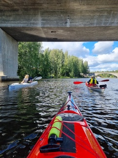 Ajoimme veden ääreen Puistonmäen rantaan rautatiesillan viereen. Kalusto alas ja tavarat kanootteihin, peräkärry ja autot parkkiin matonpesupaikan viereen ja vesille. Matkaa oli edessä 18 km, keli oli mitä mainioin, aurinko paistoi ja lievä takatuuli piti paidan kuivana.