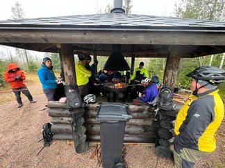 Eilen illalla päätettiin hylätä alkuperäinen reittisuunnitelma, jonka mukaan oltaisiin ajeltu Petkelsuon kautta Usmin suuntaan. Sen verran on märkää ja liukasta poluilla, että päätettiinkin suunnata perinteisemmin Erkylän suuntaan. Makkaranpaistokin saatiin järjestymään Paukunharjun kodalla. Ja olihan se mukava makkaraa paistella katon alla säältä suojassa.