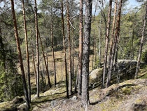 Pyörähdimme Kaksoislammen laavulla pikaisesti ja jatkoimme matkaa polulle, joka johdatti retkikuntamme kohti Karhusuota ja Iso-Karhulampea. Hetkisen huilattuamme jatkoimme Karhusuon eteläpäähän ihmettelemään korkeita ja pyöreämuotoisia kalliopaasia. Muinaisen tulivuoren nostattama kiviaines on paisunut pullataikinan tavoin pyöristyneeksi. Havaitsimme, että kalliokiipeilijät, boulderoijat olivat koetelleet taitojaan kalliopaaden kupeessa. Boulderointi on kiipeilyä ilman varmistusvälineitä matalilla korkeuksilla. Korkeitaan siinä käytetään jonkinlaista patjaa alustana, mikäli ote lipeää ja kiipeilijä tipahtaa alas. Itse emme edes yrittäneet siitä nousta ylös kalliolle.