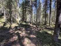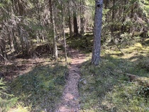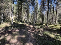 Suuntasimme askeleemme pohjoiseen johtavalle polulle ja edelleen Pikku-Usmin ohitse kohti Suoniityksi nimettyä metsäkaistaletta. Saatoimme kulkea poluilla pelkäämättä jalkojen kastumista, sillä pidempään jatkunut sateeton kausi oli kuivattanut polut. Usealla retkeläisellä oli jalkineina lenkkitossut, joilla olikin helppo taivaltaa. Ihastelimme matkalla luonnontilaisena pysynyttä kanjonia, jossa vuosikymmeniä takaperin kulki talvisin moottorikelkalla tehty hiihtolatu. Aarinansuon eteläpäässä tehtiin toistakymmentä vuotta takaperin avohakkuu. Pähkäilimme alueelle istutettujen kuusten ikää ja kasvuvauhtia.