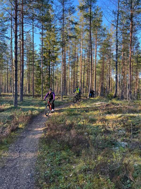 Vähemmän ajaneiden ryhmään osallistui yhteensä kuusi henkilöä, jotka kävivät menestyksekkäästi pyöräyttämässä pariin tuntiin noin 15km verran lentokentän ja Rutikan polkuja. Homma sujui Nikon johdolla mallikkaasti ja metsästä palasi varsin iloinen ryhmä takaisin maaliin.