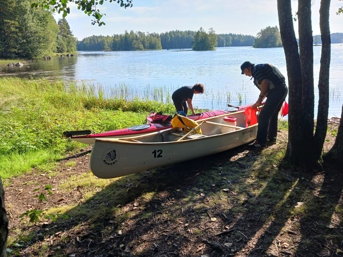 Emme olleet ainoat liikkeellä olijat, pakkaillessamme kanootteja lähtörannassa porukkaa lappoi koko ajan ohi Kyynäränharjulle reput selässä. Parkkipaikkakin oli melkein täynnä.