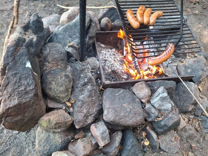 Korteniemen sauna/uimarannalle rantauduttuamme pääsimme mekin mustaamaan makkaraa, ainakin Jukka, Pirjon kanssa tyydyimme muihin eväisiin.
