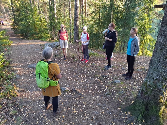 Sirpa kertoi osallistujille metsän hyvinvointia lisäävistä vaikutuksista ja kävelyn lomassa keskusteltiin luontosuhteesta. Teimme harjoitteita miten luonnon elementtejä voi käyttää murheiden käsittelyyn ja miten lisätä omaa positiivista ajattelua ja kiitollisuutta.