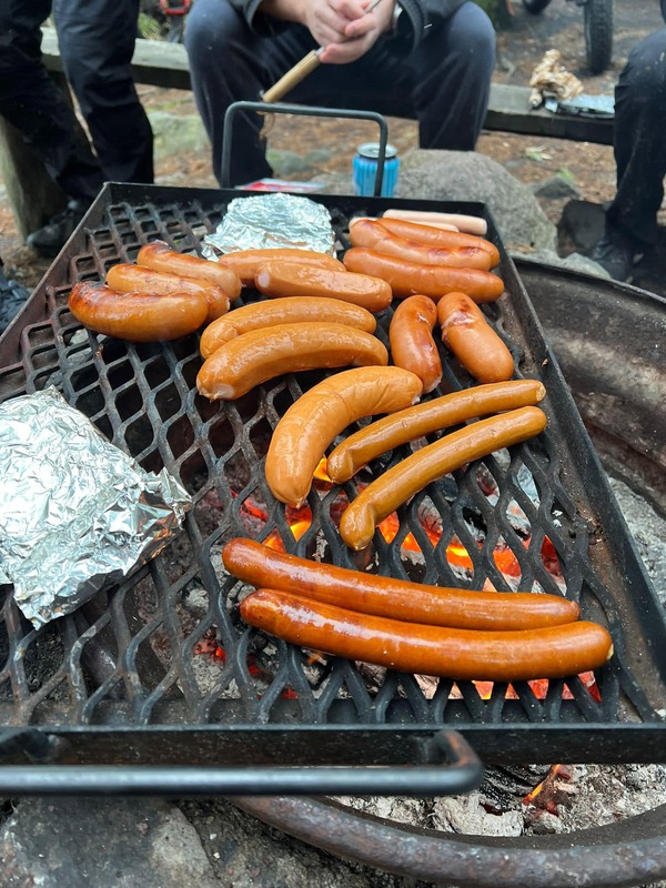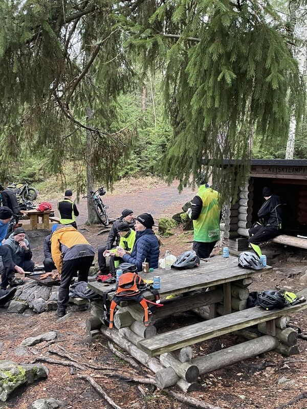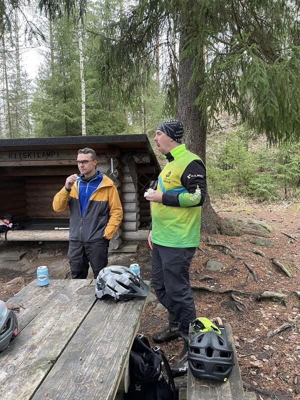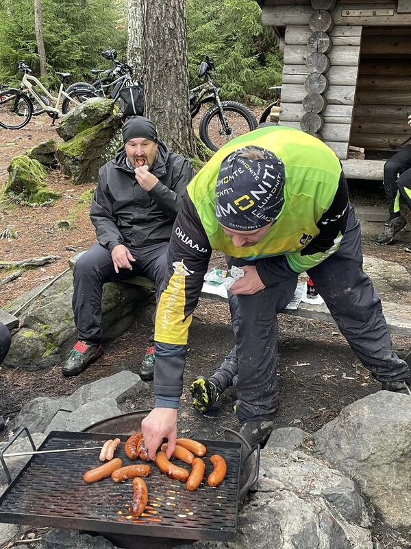 Petkelsuon jälkeen kurvattiin kohti Kiiskilammen laavua ja kaivettiin makkarat ja virvokkeet repuista. Laavulla oli tulet mukavasti odottamassa polkijoita.
