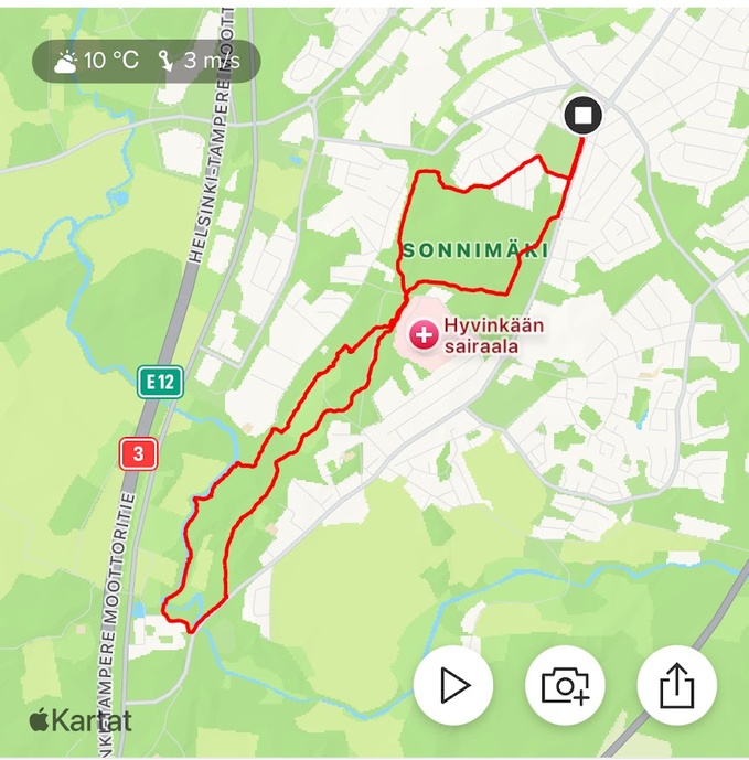 Jokivarren luontopolkua seuraillen jatkoimme Veikkaria kohti. Alitimme rautatien ja sen vierellä, läheisyydessä kulkevaa polku-uraa pitkin saavuimme Koneen entisen vierasmajan takamaastoon. Olimme pian omilla jäljillämme, mutta kiersimme Sonninmäkeä radanvarressa kulkevan ulkoilureitin kautta. Nousimme radanvarresta kohti Puolimatkan vesitornia ja oikaisimme Sonninmäen pallokentän halki sekä kevyen liikenteen väylää pitkin hautausmaan reunaan ja edelleen Uudenmaankatua lähtöpaikkaamme.