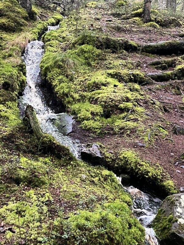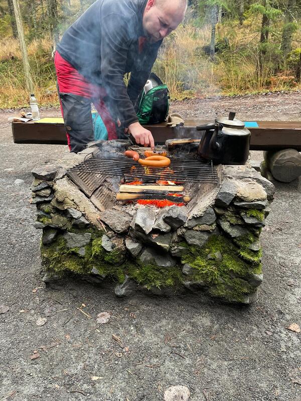Matka jatkui ja pian saavuimme Iso-Karhulammelle johtavan polun risteykseen. Päätimme käydä vilkaisemassa Karhusuolta purkautuvan veden aikaansaamaa pikku koskea. Tuolla polulla olevat lankutukset olivat todella liukkaat. Polkua ylöspäin meno onnistui mitenkuten, mutta mietin kannattaako enää palata takaisin Aarinnansuon suuntaan, kuten alun perin olin suunnitellut. Luistelemiseksi se olisi mennyt, siksi jatkoimme matkaa eteenpäin vaahtoavan kosken kuohuja hetken ihailtuamme. Kiersimme siis Karhusuon kautta polulle, joka johtaa Kaksoislammelta Latu-Miiluun. Emme poikenneet lammelle, vaan oikaisimme tuolle polulle kallioiden yli. Majan laavulla odotteli Kalevi nuotion äärellä, kahvivehkeiden kera. Seuraamme liittyi laavulla Lauri, joka saapui varsinaisesta lähdöstä hiukan myöhästyneenä omatoimisesti ja alkuperäisen reittisuunnitelman mukaista reittiä hyväksikäyttäen majalle.