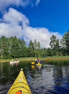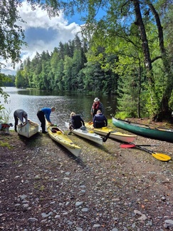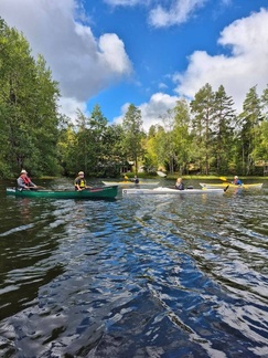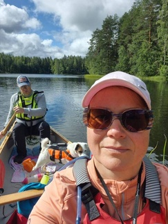 Keli oli aamusta hieman viileähkö, mutta lämpeni mukavasti päivemmällä. Kaartjärven Sähkönokasta työnsimme kaluston vesille, kaksi avokanootti kaksikkoa ja kolme kajakkiyksikköä, laivakoirakin kulki toisessa avokkaassa.