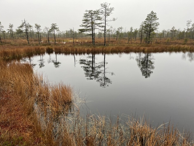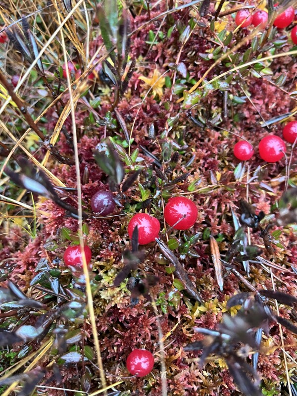 Suolla suuntasimme kulkumme allikoiden tienoille. Edellisvuoden syksyllä oli suolla vedenkorkeus mahdollisesti ylempänä, mutta kyllä nytkin piti tarkkaan katsoa, ettei suonsilmä vetänyt puoleensa. Pääsimme kiertämään mukaville paikoille kuitenkin tuttuja reittejä pitkin, olemme usein aikaisemminkin käyttäneet. Karpaloita havaittiin ja pikkuisen poimittiin ainakin pusseihin ja suuhunpantaviksi. Nautimme eväitämme lampien välisessä metsäsaarekkeessa. Topatut, rispaantuneet hiihtohaalarit olivat edelleen tutussa paikassa männynoksalla riippumassa, Lieneekö siihen ne jättänyt keväisillä hangilla hikoillut hiihtäjä. Ihailimme maisemaa ja havainnoimme luontoa sekä sammalten punaväriä. Palailimme metsänreunaan ja astelimme ojanvarsipolkua alavirran suuntaan. Ojan ylitys tapahtui taas padon kohdalta, sillä vuolaana virranneen uoman ylitys ei muuten ollut mahdollista.