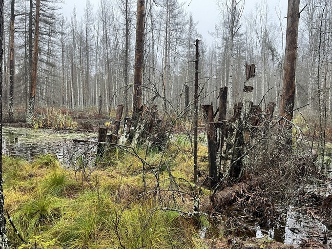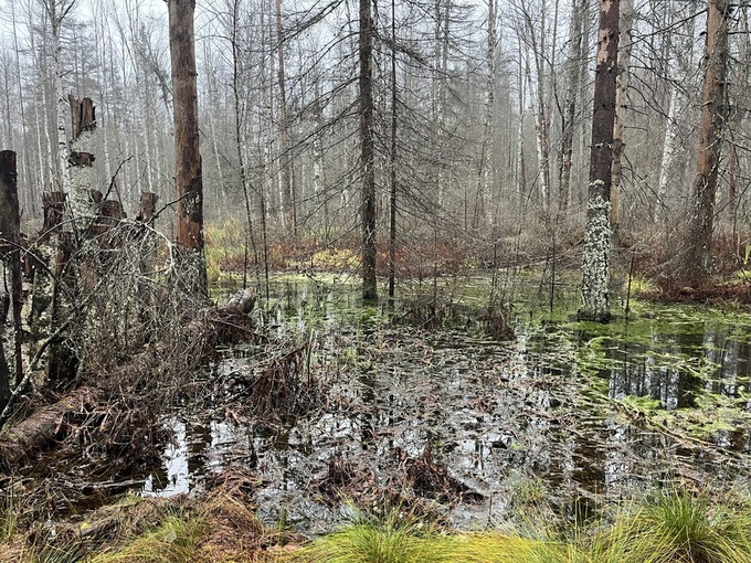 Kumisaappailla varustautuneina astelimme Rauhalan perukoilta suon reunaan. Suon kaakkoislaidalla on tehty ennallistamistöitä kaatamalla suo-ojan reunoilta puustoa ja rakentamalla ojaan patoja. Tarkoituksena on tietenkin nostaa suolla olevan veden pintaa. Vettä ja märkiä maastokohtia tuli toki vastaan jo ennekuin pääsimme suon itälaidalla olevan valtaojan varteen. No, ei sentään kenelläkään saappaat hörpänneet suovettä, mutta taisi kuitenkin jonkun takapuoli pikkaisen kastua teutaroidessamme epätasaisessa maastossa. Ojien ylittäminen ei käy loikkaamalla, mutta patojen kohdalla se onnistuu ihan kävellen. Jäljistä päätellen niitä hyödyntävät myös alueen eläimet.