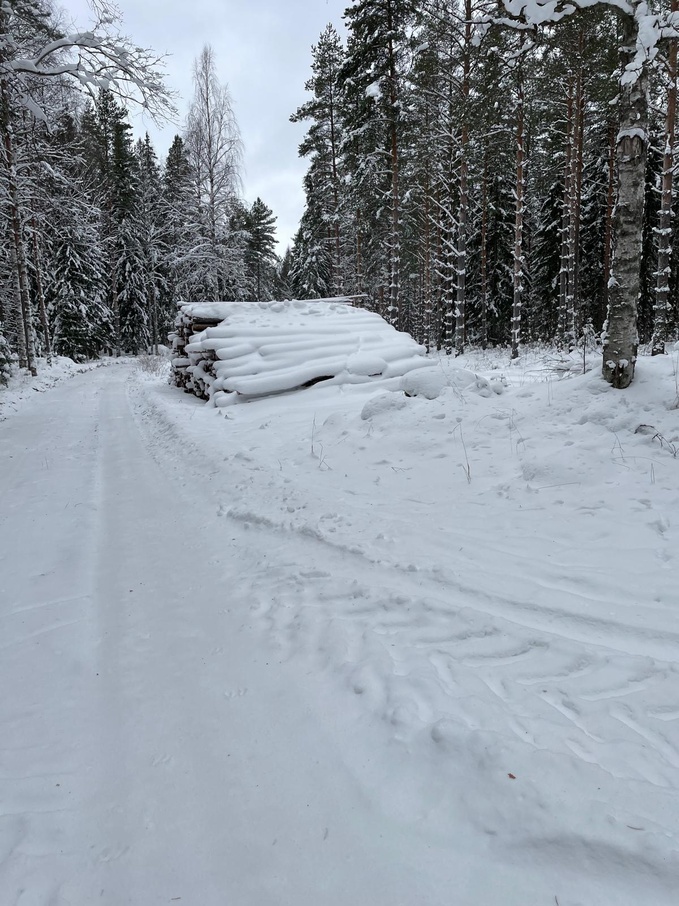 Yritin edetä tiellä mahdollisimman varovasti, mutta välillä silmiinpistäviä kiviä oli niin paljon, että päädyin kantamaan suksiani osan matkaa. Neljän majan risteyksestä löysin useamman tukkikasan. Jatkoin vielä puolisen kilometriä kohti Omaa Kotia, mutta koska samaan suuntaan johtivat myös metsäkoneen jäljet, päätin luopua Suonummen tavoittelemisesta ja kääntyä takaisin.